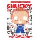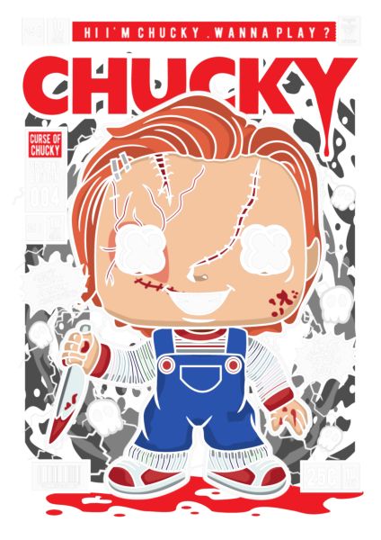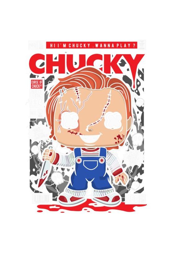 Funko Pop Chucky με κόκκινα μαλλιά, μαχαίρι, τίτλος «CHACY», συννεφάκια με φράσεις, φόντο σκοτεινό.