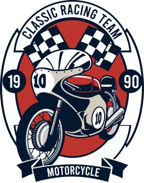 Αγωνιστική μοτοσυκλέτα cafe racer με αριθμό 10, κόκκινο κυκλικό φόντο, καρό σημαίες, κείμενα «CLASSIC RACING TEAM».