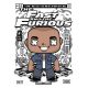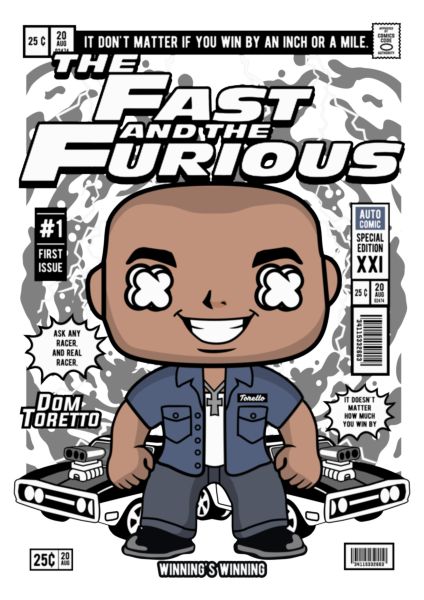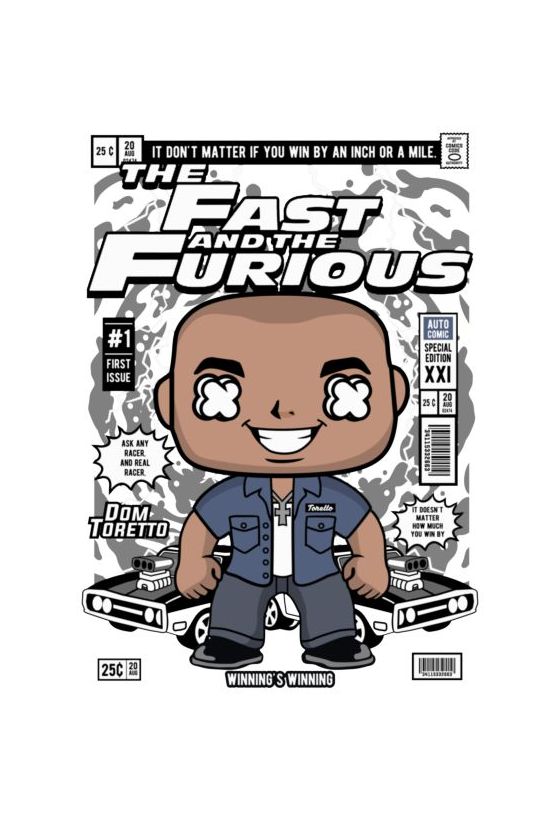 Funko Pop Dom Toretto (Fast and Furious), μπλε πουκάμισο, φόντο με μυϊκά αυτοκίνητα.