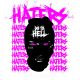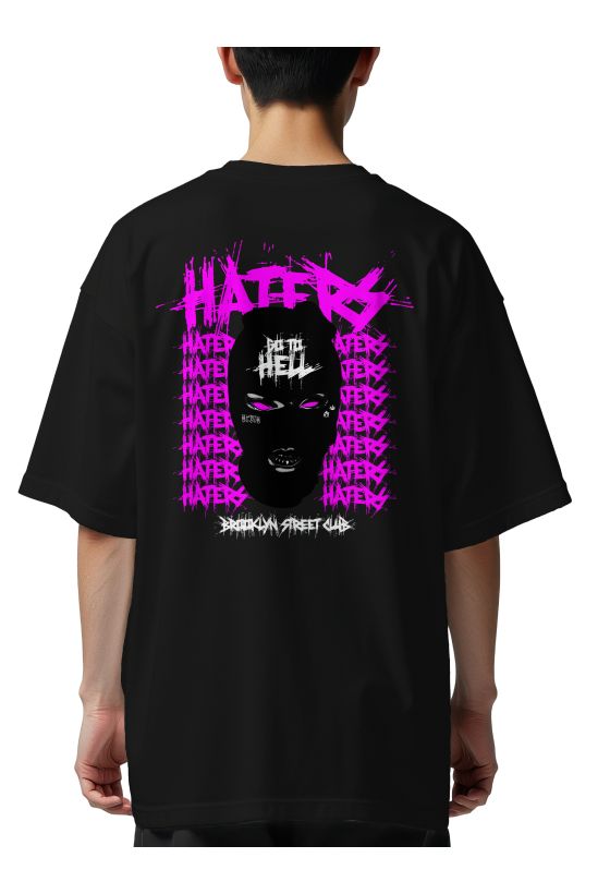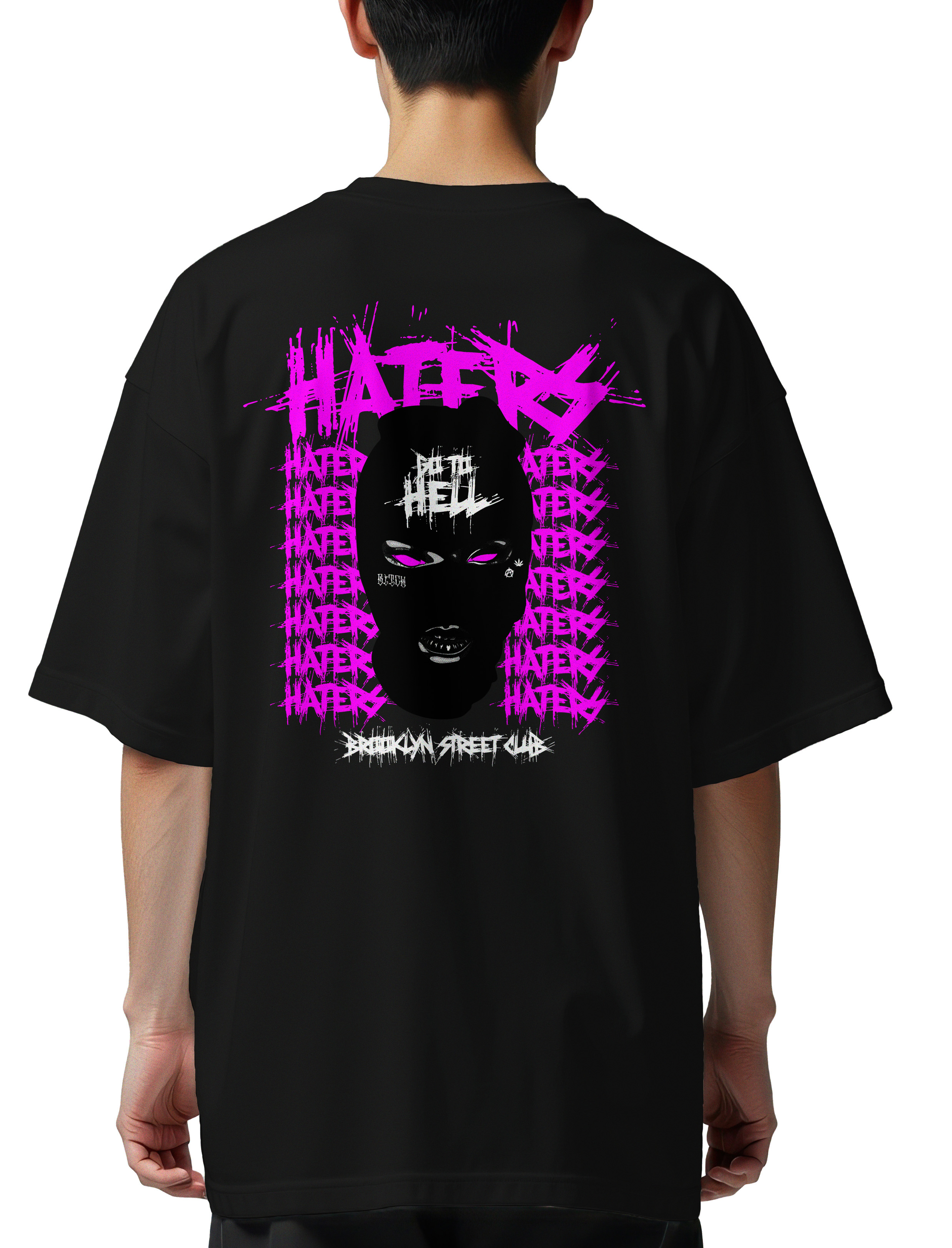 Φιγούρα με μπαλακλάβα και neon ροζ μάτια· κείμενο «HATERS GO TO HELL».