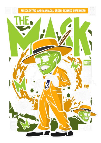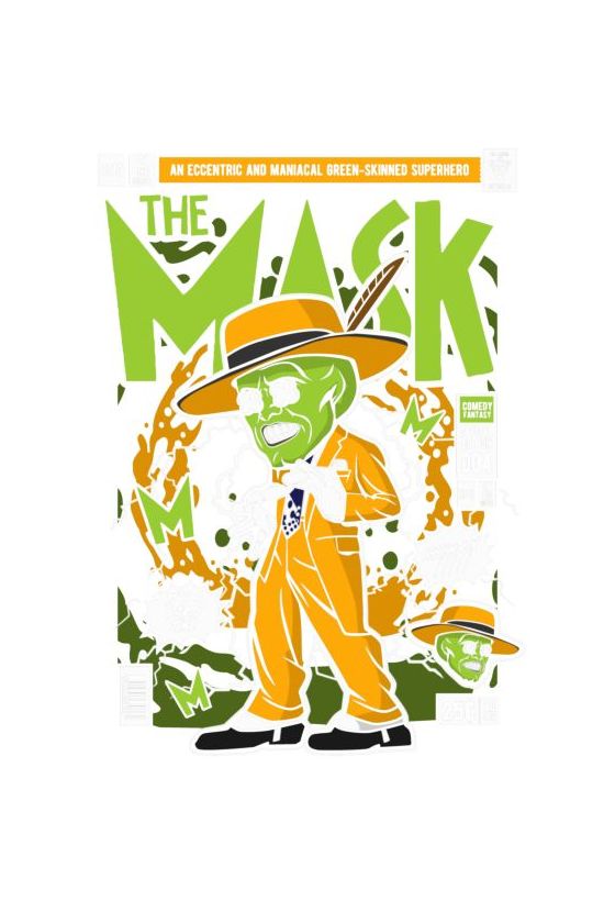 The Mask σε κόμικ εξώφυλλο, πράσινο πρόσωπο, κίτρινο κοστούμι, quote "SSSSSMOKIN".