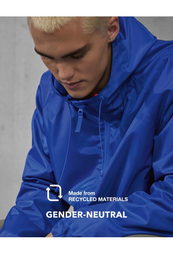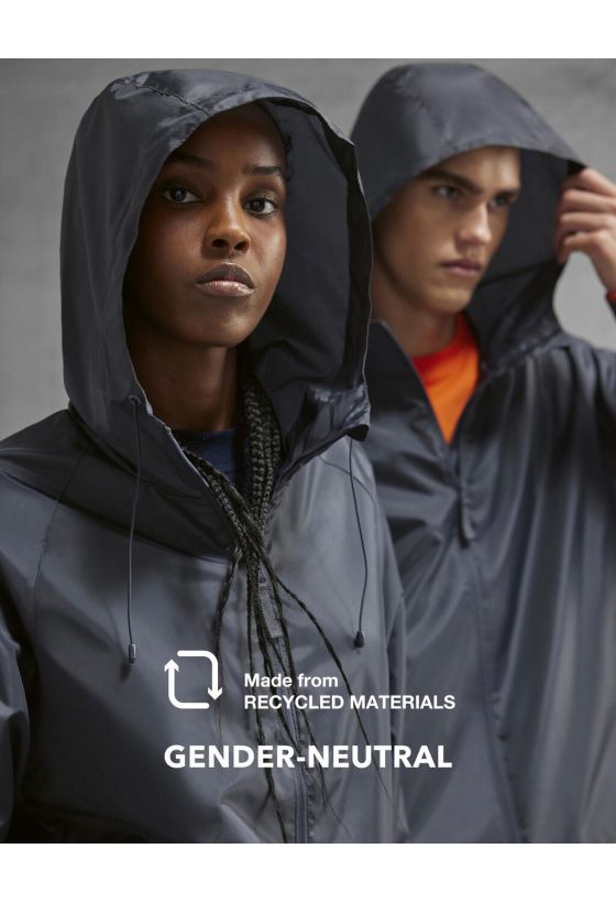 Unisex αντιανεμικό από 100% ανακυκλωμένο πολυεστέρα (πιστοποίηση RCS) με επένδυση σώματος από ανακυκλωμένο δίχτυ (mesh) πολυεστέρα και επένδυση μανικιών από ανακυκλωμένο πολυεστέρα. Διαθέτει υδροαπωθητική επίστρωση DWR χωρίς PFAS/φθόριο, σύμφωνα με το πρότυπο OEKO-TEX STANDARD 100 (Ιανουάριος 2024). Μοντέρνα εφαρμογή με επένδυση mesh για διαπνοή, ρυθμιζόμενη κουκούλα τριών τμημάτων με κορδόνι, ραγκλάν μανίκια για άνεση και ευκινησία, δύο μπροστινές τσέπες με φερμουάρ, ημιελαστικές μανσέτες και ρυθμιζόμενο στρίφωμα με κορδόνι για καλύτερη εφαρμογή.