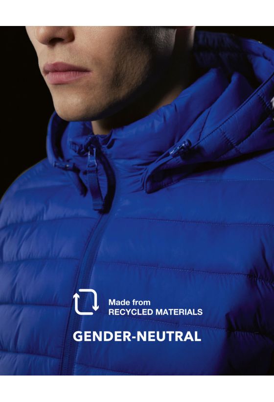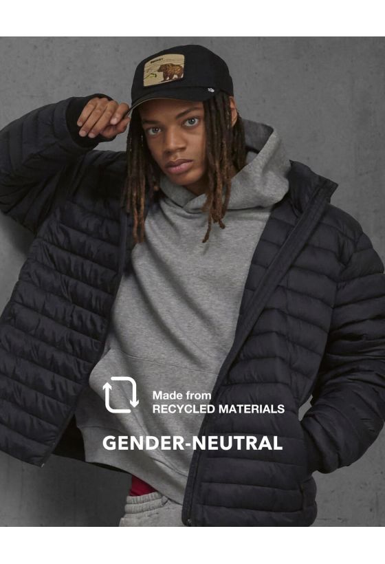 Unisex μπουφάν από 100% ανακυκλωμένο νάιλον (πιστοποίηση RCS) με επένδυση από 100% ανακυκλωμένο συνθετικό πούπουλο (fake down, RCS certified) και φόδρα από 100% ανακυκλωμένο νάιλον. Διαθέτει επίστρωση DWR (Durable Water Repellent) χωρίς PFAS/φθόριο, σύμφωνα με το πρότυπο OEKO-TEX STANDARD 100 (Ιανουάριος 2024). Προσφέρει ανάλαφρη αλλά θερμή μόνωση, αποσπώμενη και ρυθμιζόμενη κουκούλα με ψηλό επενδυμένο γιακά για προσαρμοσμένη προστασία, εσωτερική αντιανεμική πατιλέτα πλήρους μήκους και ριπ τελειώματα με ελαστάνη στα μανίκια για επιπλέον μόνωση. Διαθέτει δύο μπροστινές τσέπες με φερμουάρ.