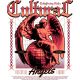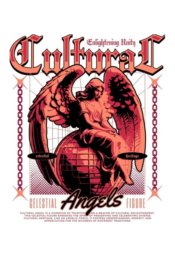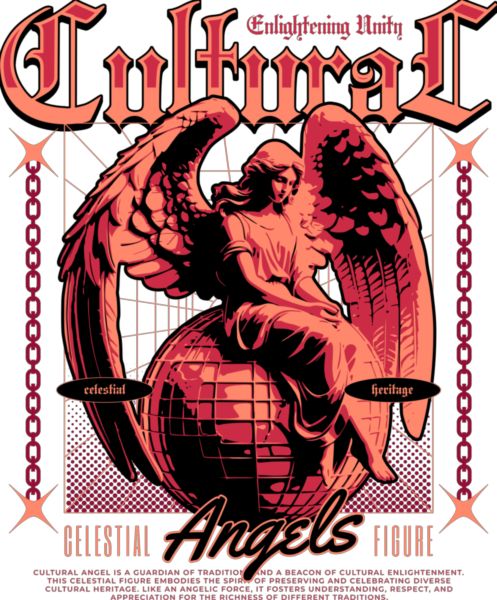 Αγγελική φιγούρα με φτερά, καθιστή σε σφαίρα, σε παλέτα μαύρου-κόκκινου-πορτοκαλί. Πλαισιώνεται από αλυσίδες και γεωμετρικά μοτίβα.