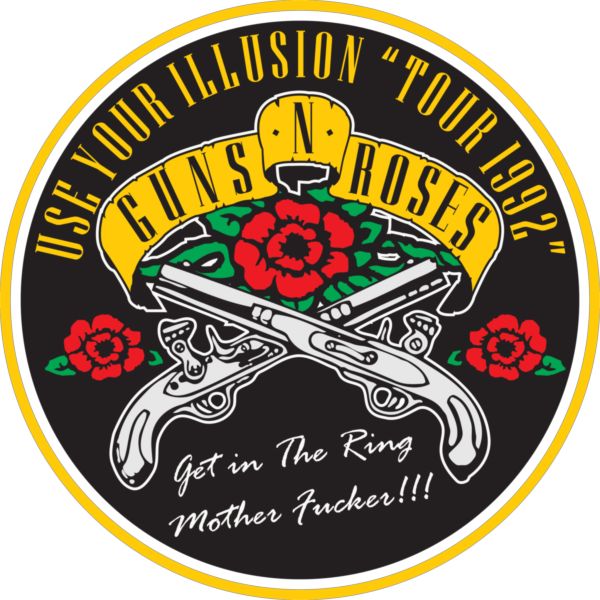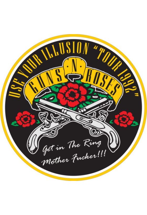 Κυκλικό λογότυπο Guns N’ Roses «Use Your Illusion Tour 1992» με σταυρωτά πιστόλια και πανό.