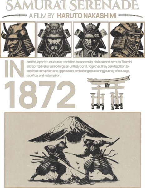 Vintage αφίσα ταινίας «Samurai Serenade» (1872). Σαμουράι, κράνη, Όρος Φούτζι και πύλη torii σε στυλ ξυλογραφίας.