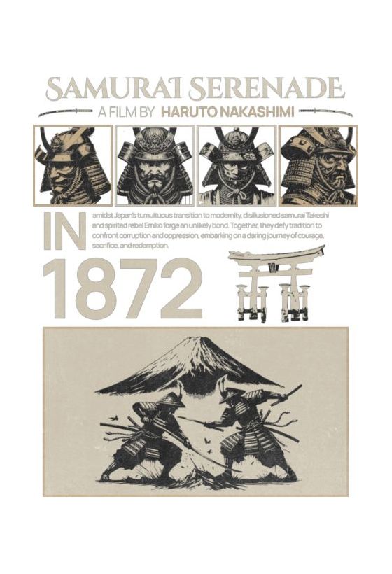 Vintage αφίσα ταινίας «Samurai Serenade» (1872). Σαμουράι, κράνη, Όρος Φούτζι και πύλη torii σε στυλ ξυλογραφίας.