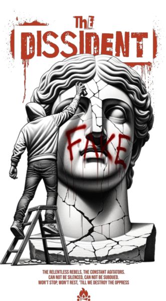 Φιγούρα με κουκούλα γράφει «FAKE» σε προτομή. Κείμενο «Ο ΔΙΑΦΟΡΗΣ», θέμα εξέγερσης.