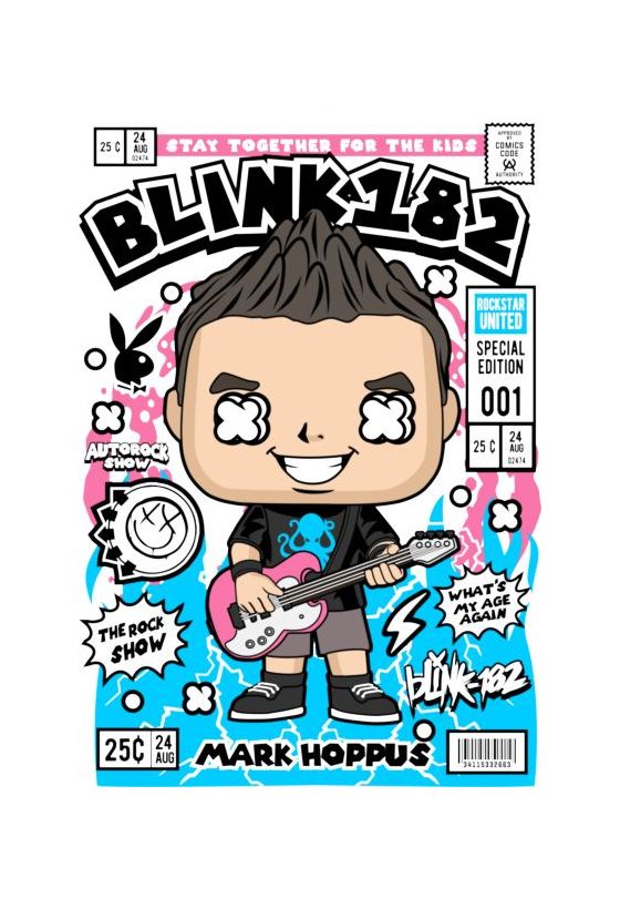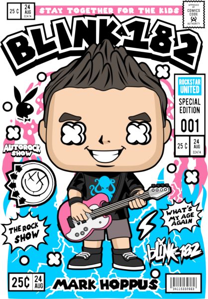 Funko Pop χαρακτήρας με κιθάρα σε ροζ-μπλε φόντο. Κείμενα "STAY TOGETHER FOR THE KIDS" και "ROCKSTAR UNITED".