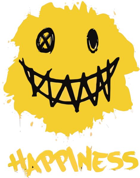 Κίτρινο smiley με δόντια και μάτι διαγραμμένο, λέξη "ΕΥΤΥΧΙΑ".