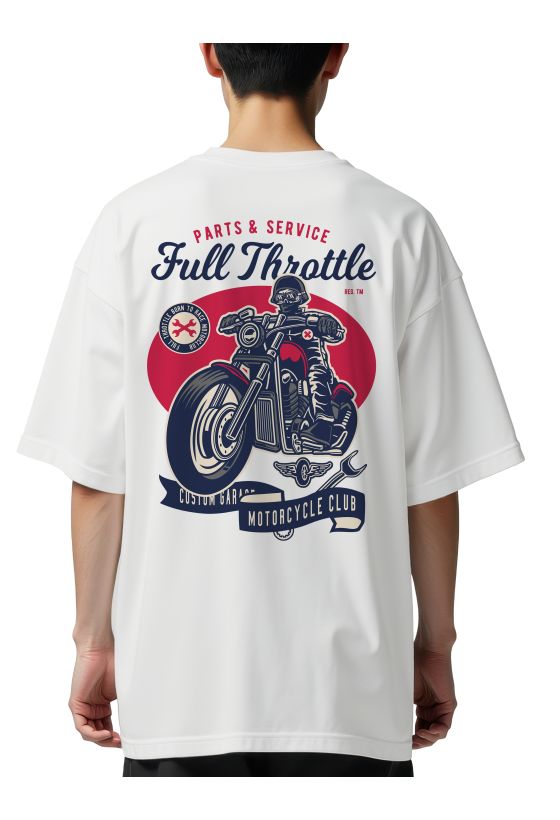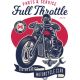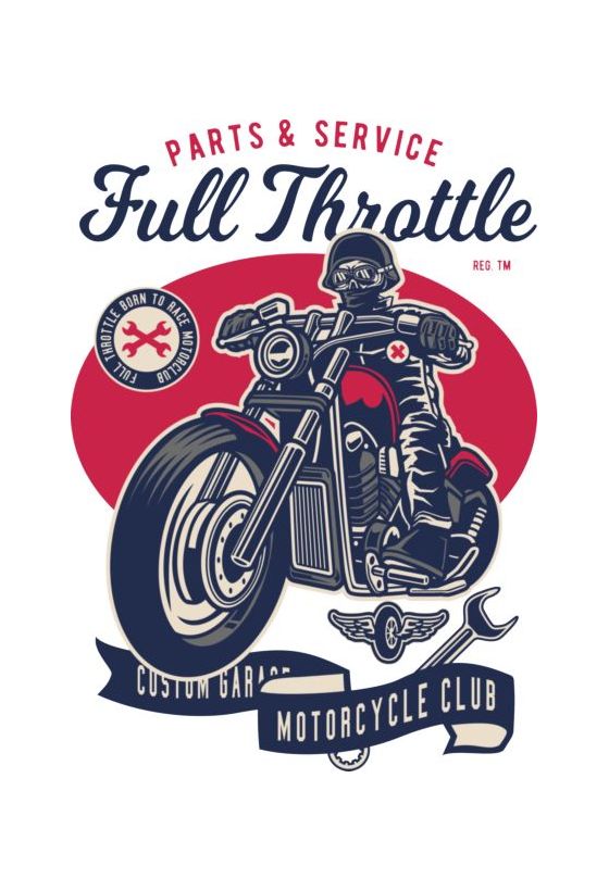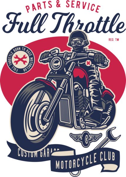 Μοτοσυκλετιστής σε κόκκινο κύκλο, κείμενα «PARTS & SERVICE», «CUSTOM GARAGE».