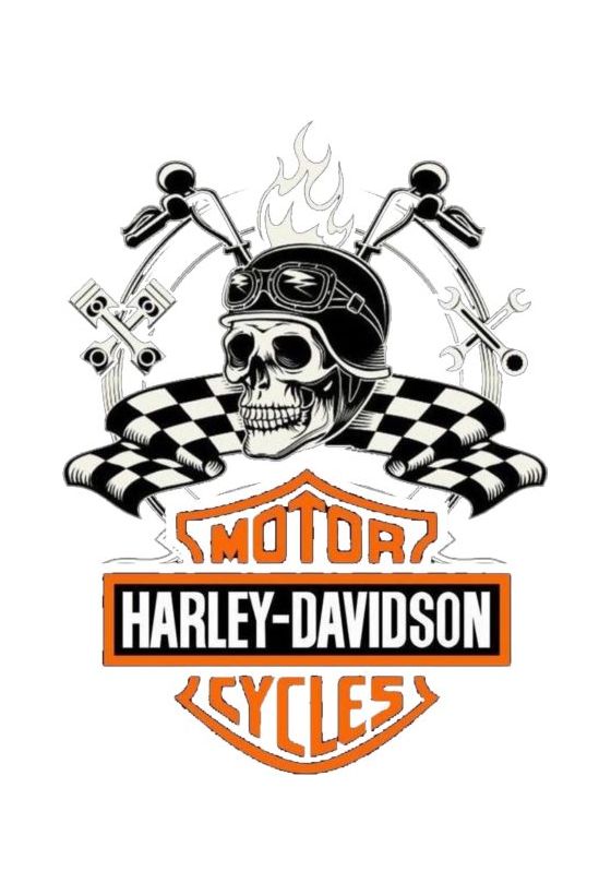 Γραφιστικό σχέδιο με κρανίο που φορά κλασικό κράνος και γυαλιά, διακοσμημένο με φλόγες και στοιχεία Harley-Davidson.