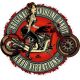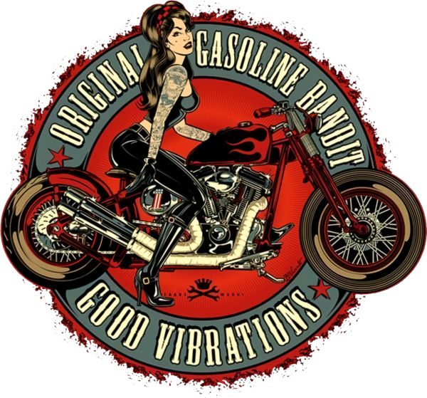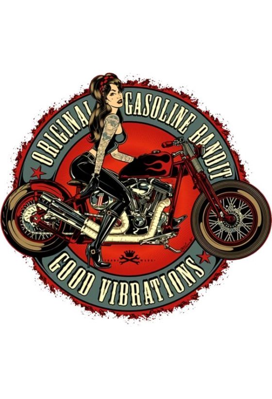 Σχέδιο με pin-up κορίτσι σε κόκκινη μοτοσυκλέτα, με το κείμενο Gasoline Bandit και rockabilly αισθητική.
