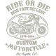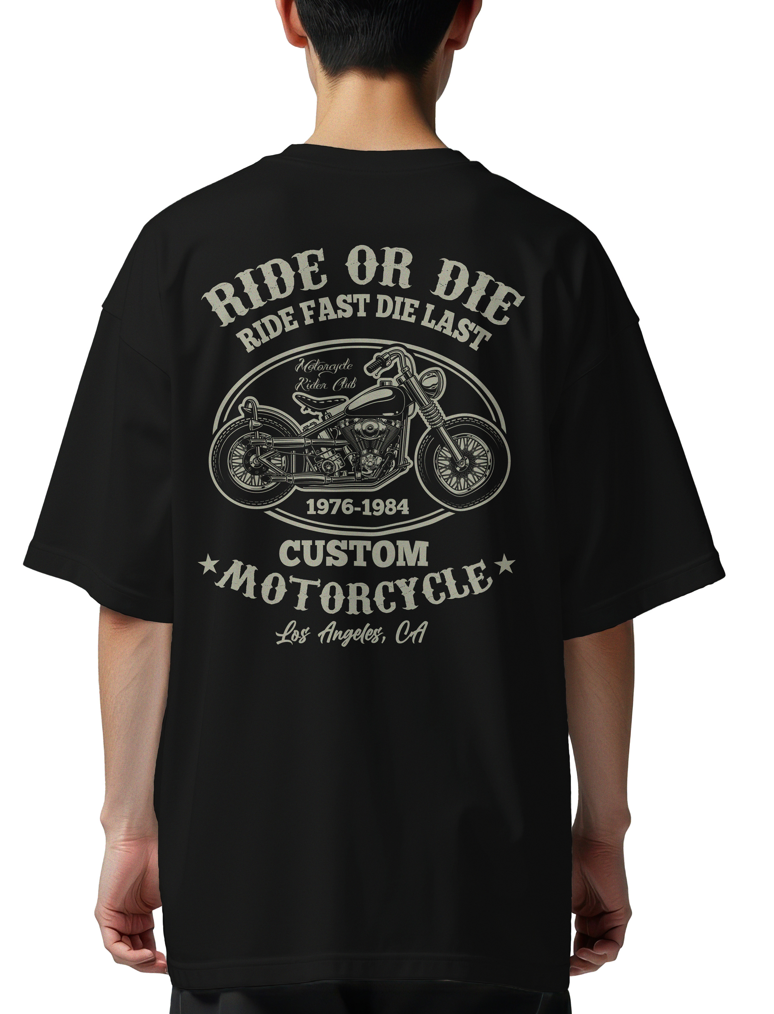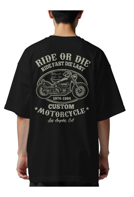 Vintage μοτοσυκλέτα σε οβάλ πλαίσιο με κείμενο "RIDE OR DIE" και "CUSTOM MOTORCYCLE".
