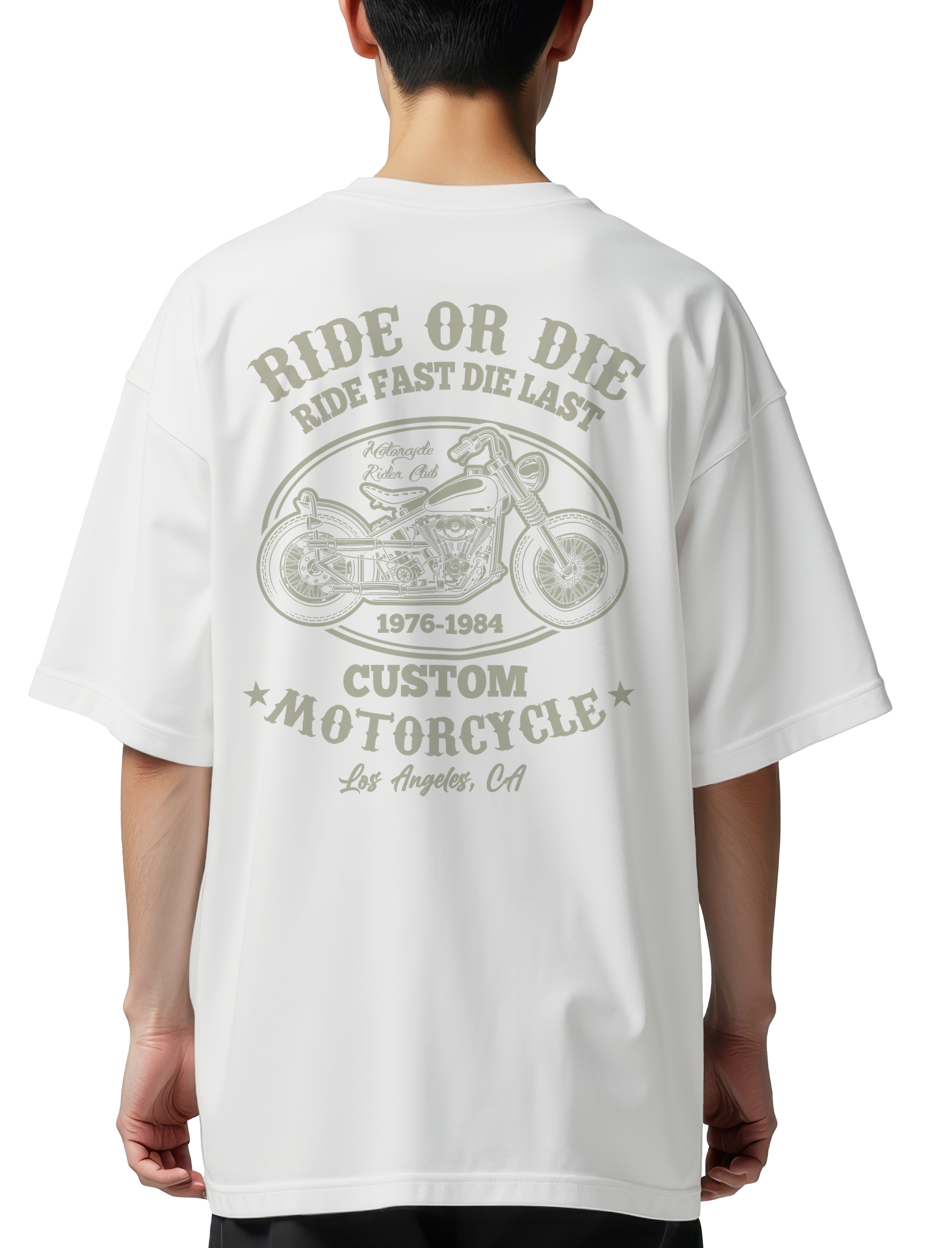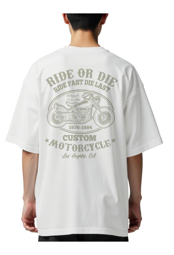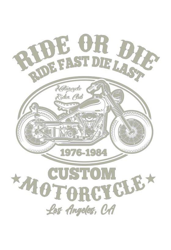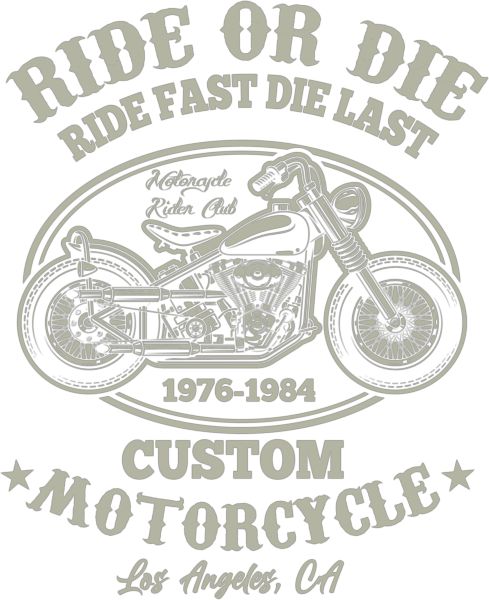Vintage μοτοσυκλέτα σε οβάλ πλαίσιο με κείμενο "RIDE OR DIE" και "CUSTOM MOTORCYCLE".