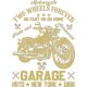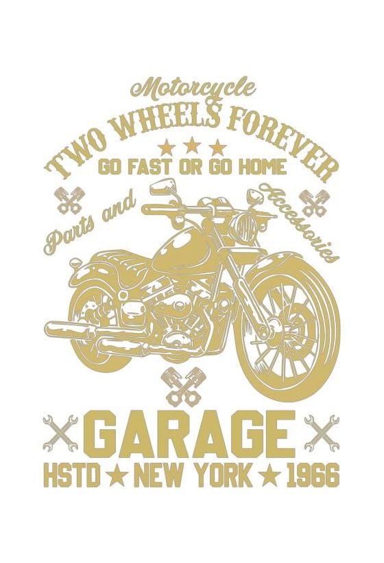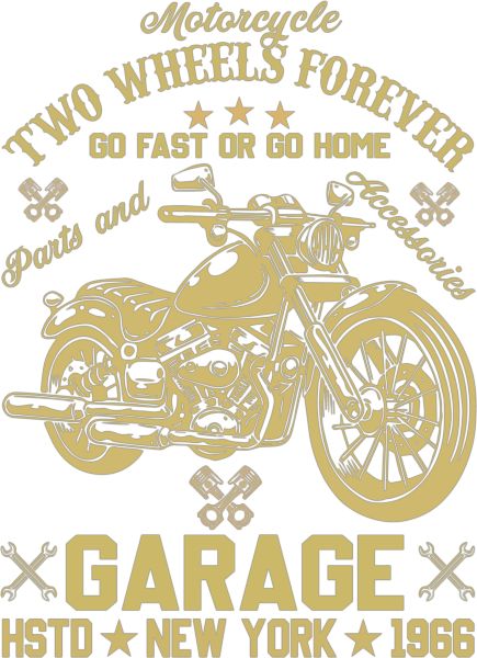 Vintage σχέδιο μοτοσυκλέτας με διακοσμητικά κείμενα όπως "Two wheels forever", "Garage".