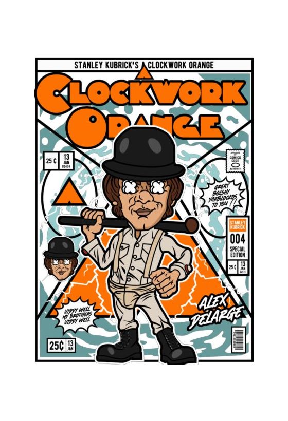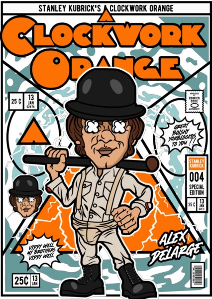 Ρετρό εξώφυλλο κόμικ εμπνευσμένο από το «A Clockwork Orange» με τον Alex DeLarge σε καρτουνίστικο στυλ.