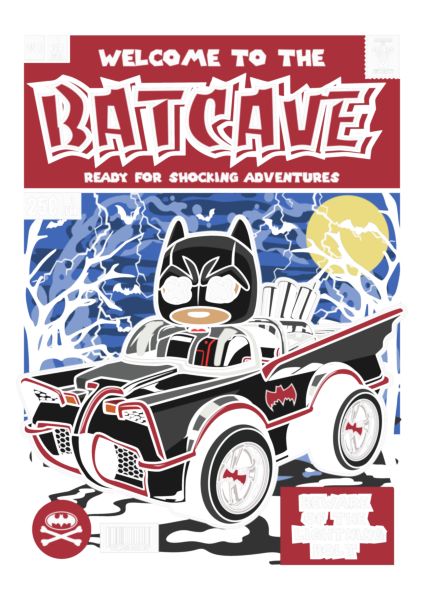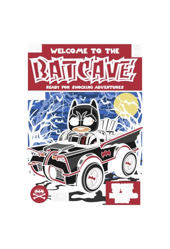Chibi Batman που οδηγεί Batmobile, εξώφυλλο κόμικ «WELCOME TO THE BATCAVE».