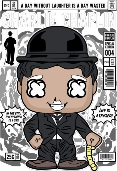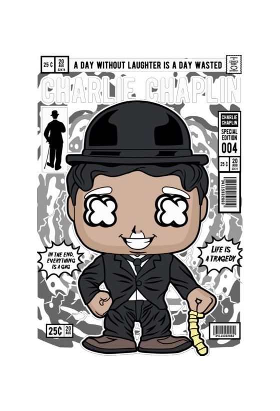 Funko Pop εκδοχή Charlie Chaplin («The Tramp»), καπέλο, μπαστούνι, κείμενα «Μια μέρα χωρίς γέλιο…», «Special Edition 004».
