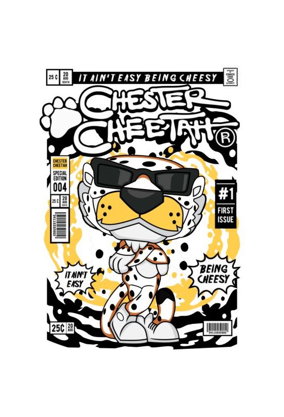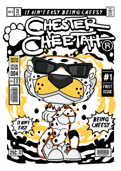 Funko Pop Chester Cheetah, γυαλιά, μαύρο φόντο με κίτρινες πιτσιλιές, τίτλος «It Ain’t Easy Being Cheesy», «#1 First Issue».