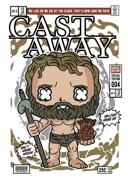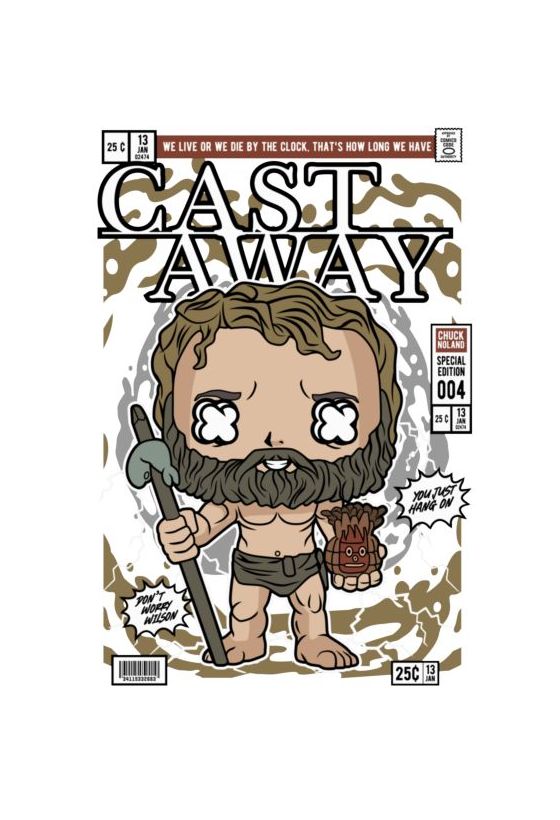 Funko Pop εκδοχή Chuck Noland (Cast Away) με Wilson, φόντο νησιού, στοιχεία κόμικ «#1 First Issue», αποφθέγματα.