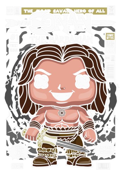 Funko Pop Conan the Barbarian με σπαθί, εξώφυλλο κόμικ με τίτλο και στοιχεία έκδοσης.