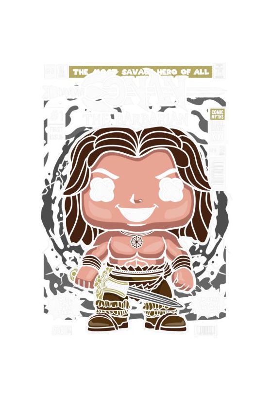 Funko Pop Conan the Barbarian με σπαθί, εξώφυλλο κόμικ με τίτλο και στοιχεία έκδοσης.