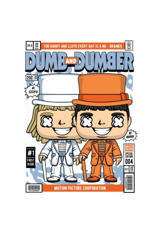 Funko Pop Harry & Lloyd (Dumb and Dumber) με μπλε/πορτοκαλί σμόκιν, εξώφυλλο κόμικ.