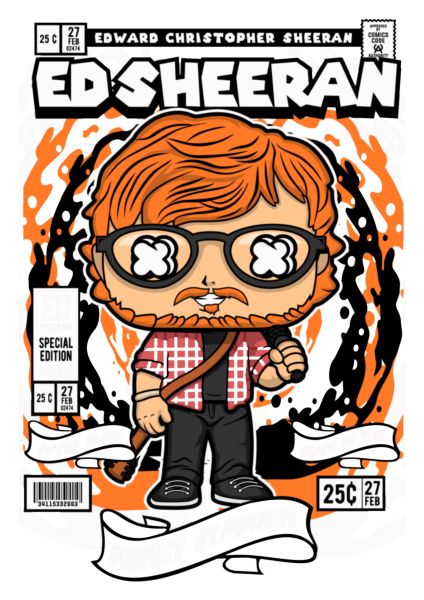 Funko Pop Ed Sheeran με μικρόφωνο, εξώφυλλο κόμικ με τίτλο και ονόματα τραγουδιών.
