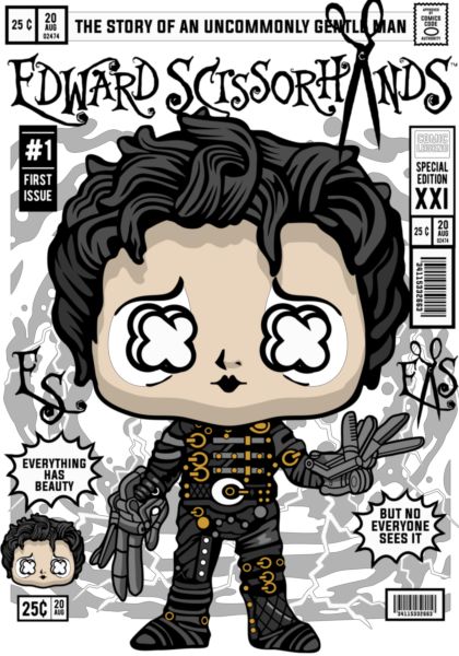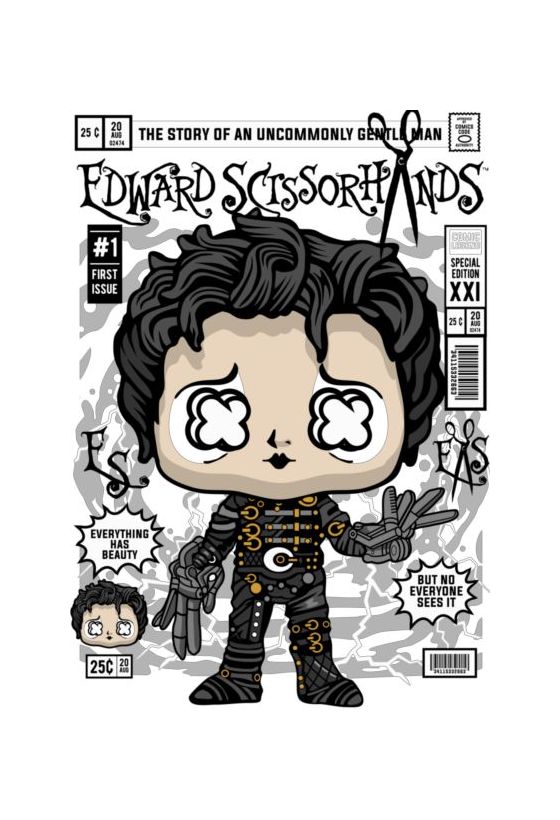 Funko Pop Edward Scissorhands, ασπρόμαυρο με χρυσές λεπτομέρειες, εξώφυλλο κόμικ.