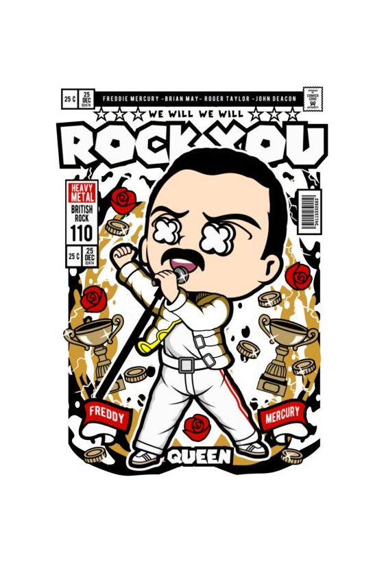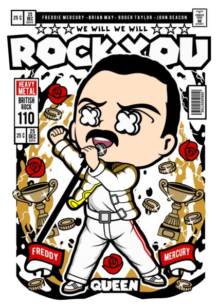 Chibi Freddie Mercury με κίτρινο σακάκι, εξώφυλλο κόμικ «ROCK YOU».