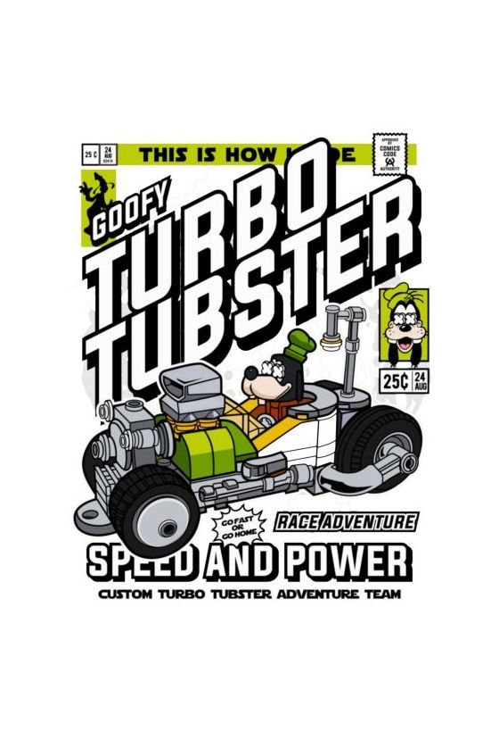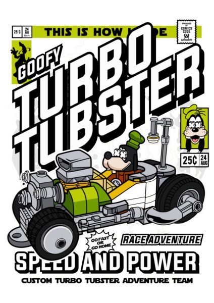 Goofy σε hot rod «Turbo Tubster» σε στυλ vintage κόμικ, με τίτλους «SPEED AND POWER».