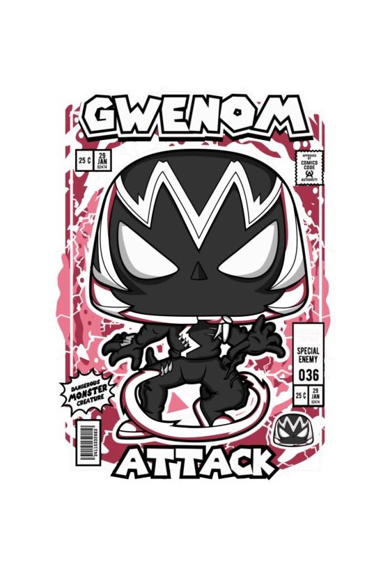 Gwenom (Gwen Stacy + Venom) σε εξώφυλλο κόμικ, ασπρόμαυρο με ροζ και τίτλους «GWENOM» / «ATTACK».