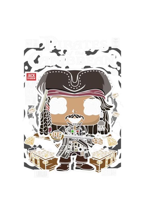 Funko Pop Jack Sparrow σε κόμικ στυλ με σπαθί, σεντούκια και κεραυνούς.