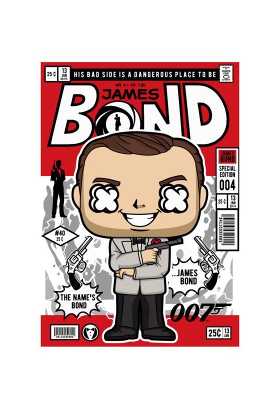 Funko Pop James Bond με κοστούμι και πιστόλι, κόμικ στοιχεία και κείμενα «007».