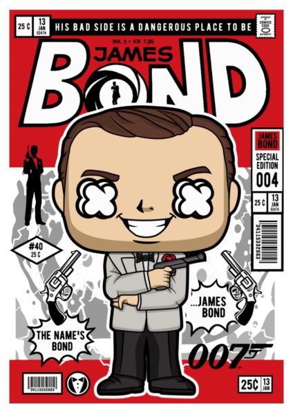 Funko Pop James Bond με κοστούμι και πιστόλι, κόμικ στοιχεία και κείμενα «007».