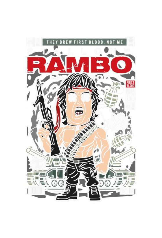 Funko Pop Rambo με κορδέλα και πολυβόλο, κόμικ εξώφυλλο με στρατιωτικά στοιχεία.