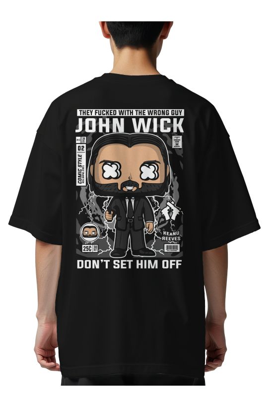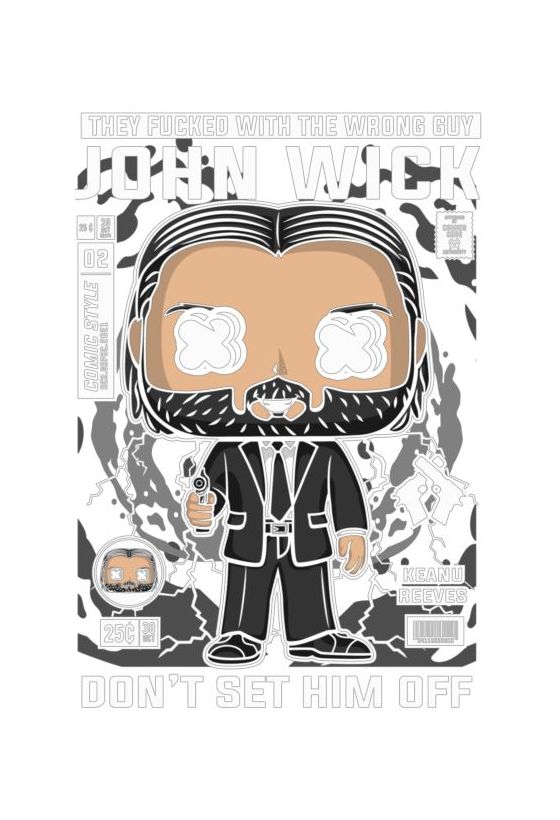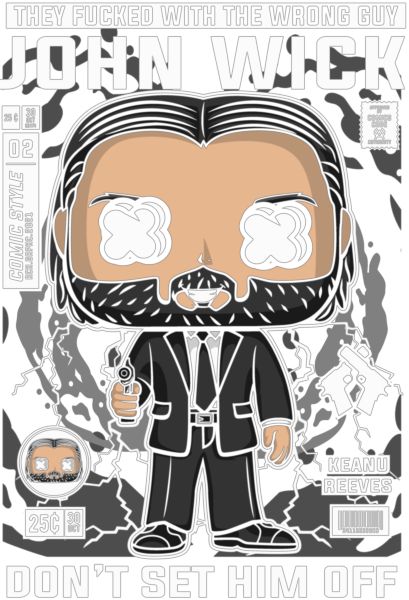 Funko Pop John Wick με κοστούμι και πιστόλι, quotes και κόμικ στυλ.
