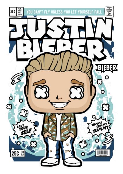 Funko Pop Justin Bieber σε κόμικ εξώφυλλο με μουσικές νότες και quotes.