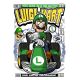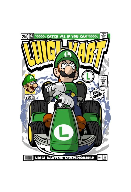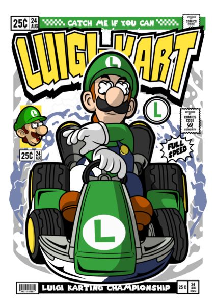 Luigi σε πράσινο καρτ, κόμικ εξώφυλλο με τίτλους και σφραγίδες.