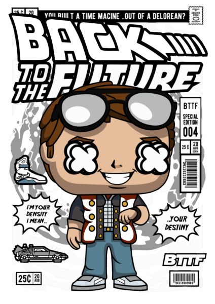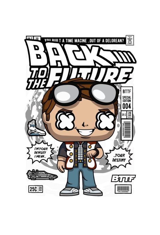 Marty McFly σε chibi στυλ, εξώφυλλο κόμικ "Back to the Future" με DeLorean και quotes.