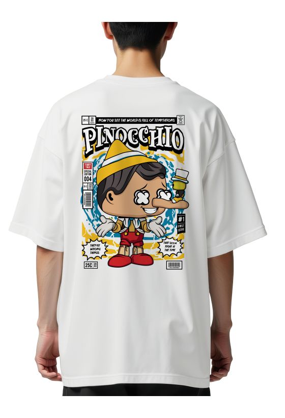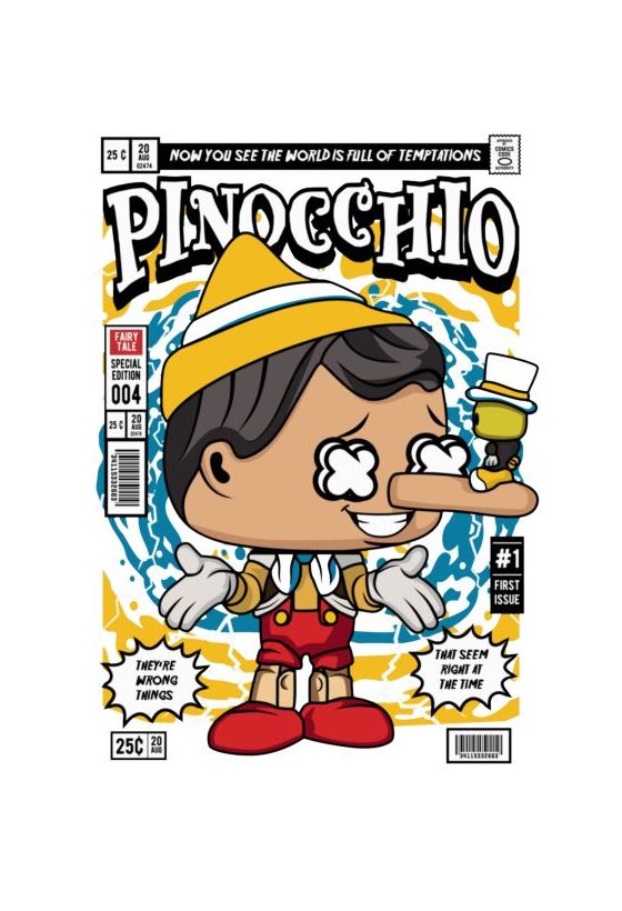 Pinocchio με μακριά μύτη σε κόμικ εξώφυλλο με quotes για πειρασμό.