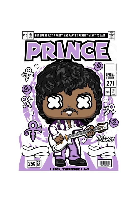 Prince σε Funko Pop στυλ με μωβ κοστούμι και κιθάρα, εξώφυλλο κόμικ "PURPLE RAIN".