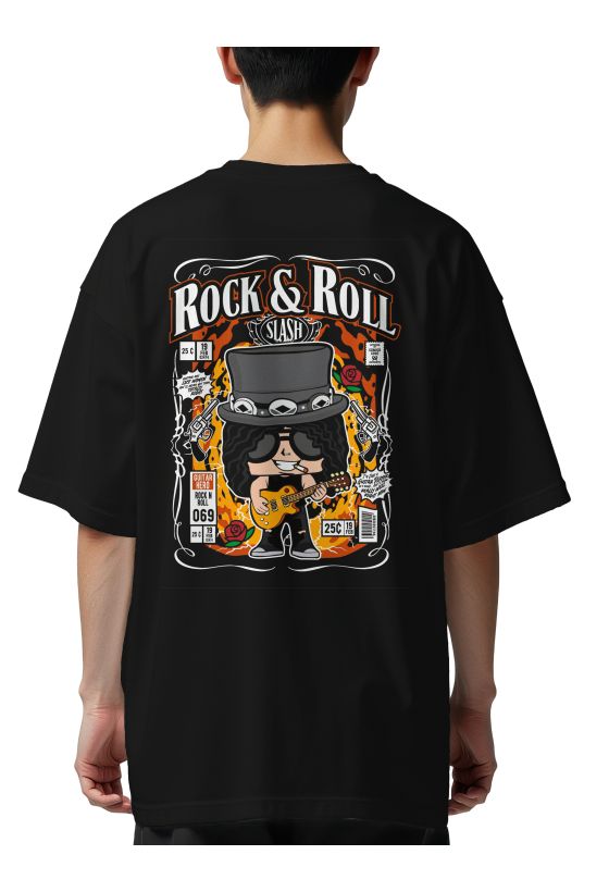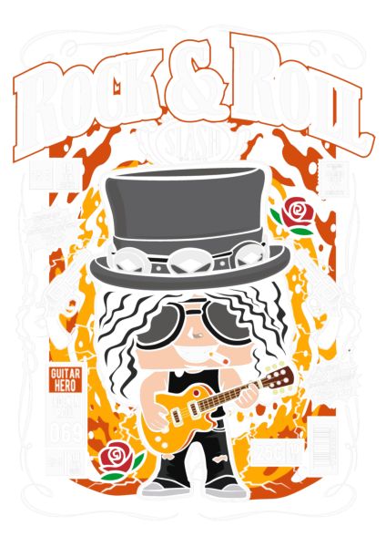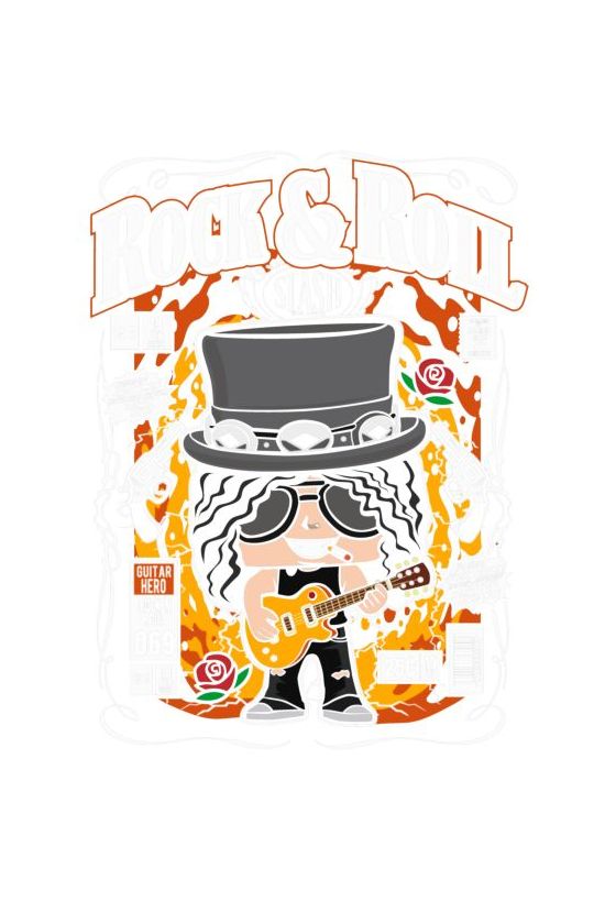 Slash σε κόμικ στυλ, κιθάρα, καπέλο, φόντο με φλόγες και πανό "Rock & Roll".