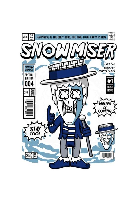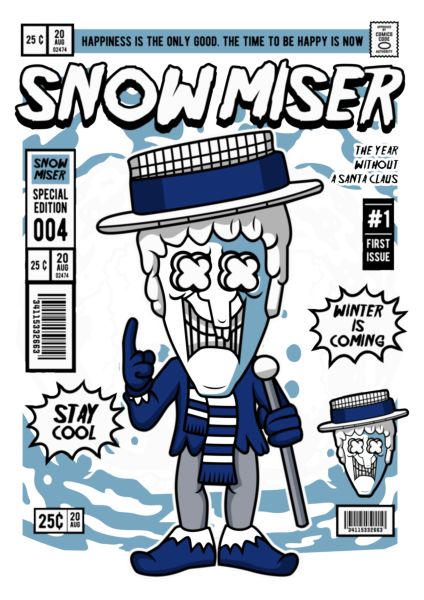 Snow Miser σε vintage κόμικ στυλ, quotes "WINTER IS COMING", "STAY COOL".