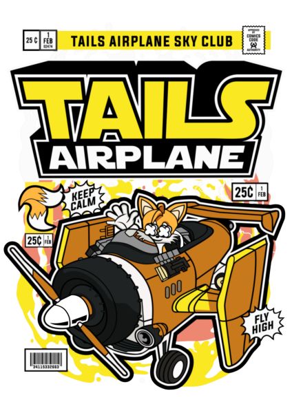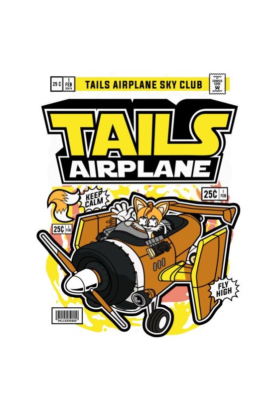 Tails (Sonic) σε αεροπλάνο, εξώφυλλο κόμικ με quotes "Keep Calm", "Fly High".