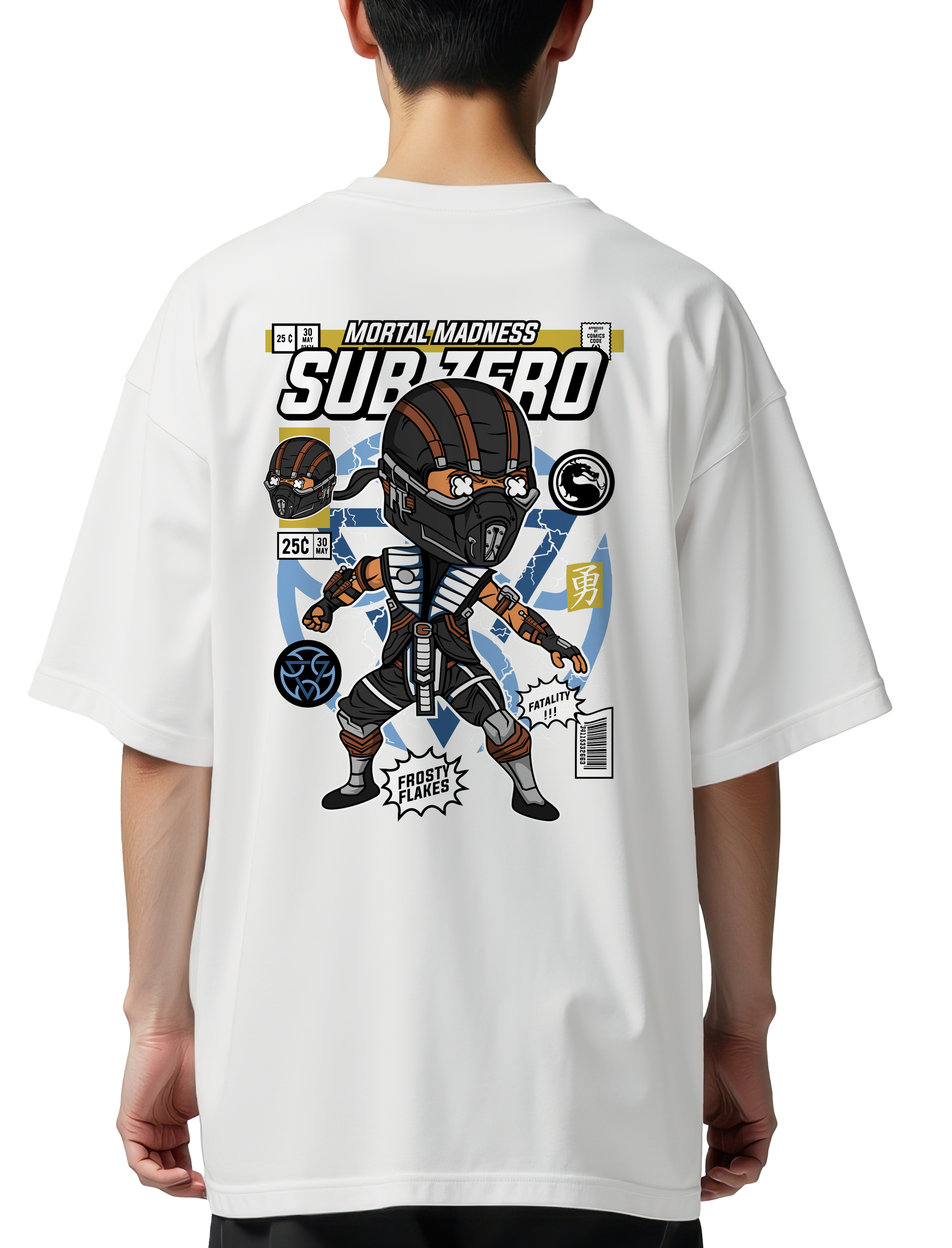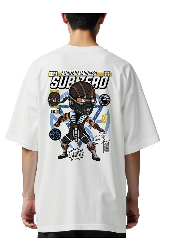 Sub-Zero (Mortal Kombat) σε chibi κόμικ, μπλε στολή, μάσκα, κεραυνοί, κείμενα "Mortal Madness", "Fatality!!!".