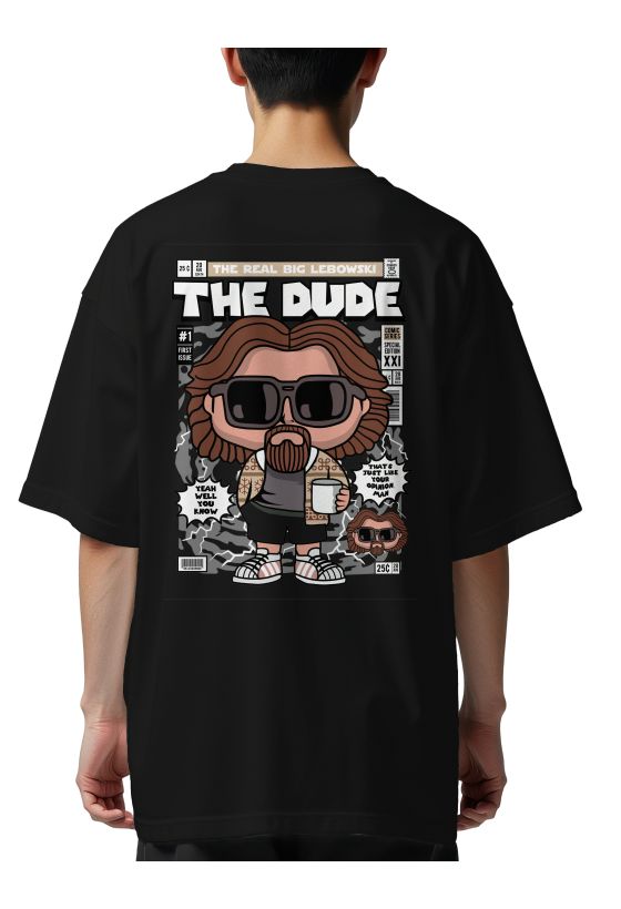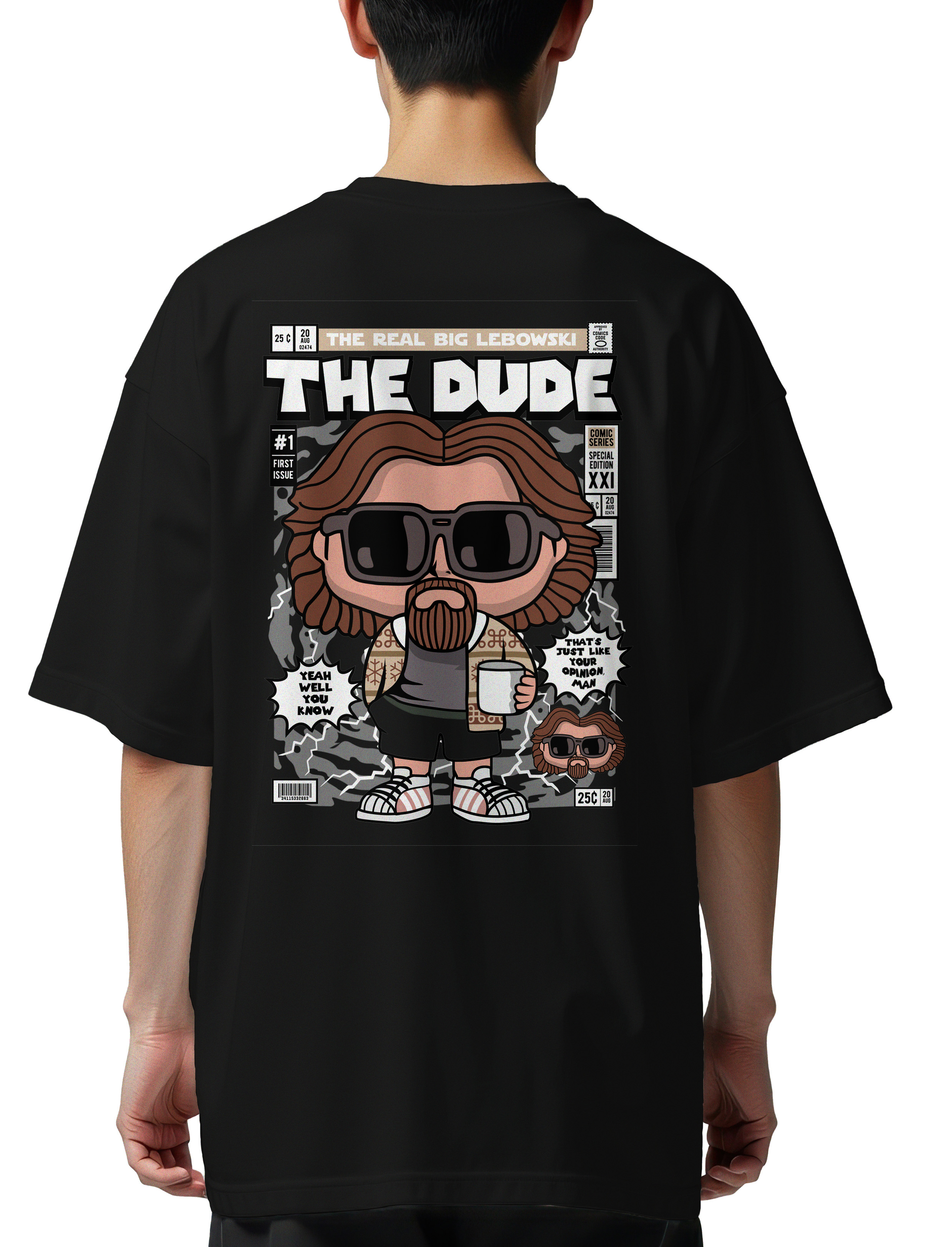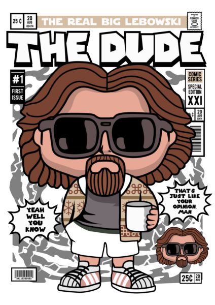 The Dude (Big Lebowski) σε κόμικ εξώφυλλο, με quotes και κούπα.