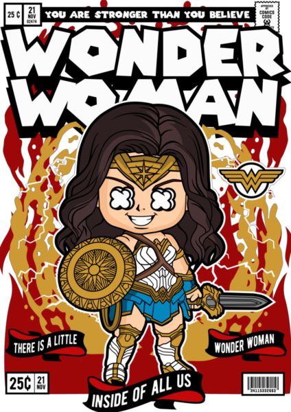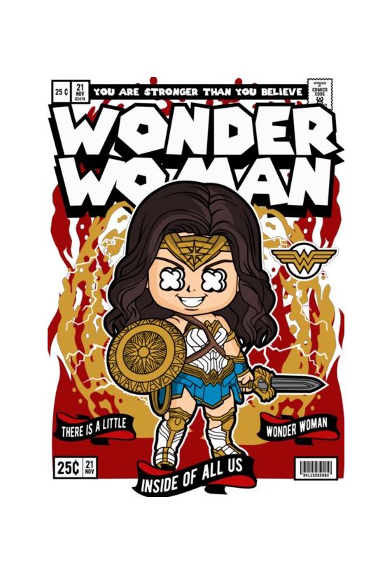 Wonder Woman σε chibi εξώφυλλο κόμικ με ασπίδα και σπαθί, τίτλος "WONDER WOMAN".