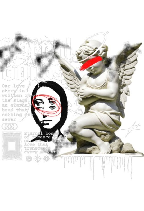 Κείμενο «Eternal Bonds» δίπλα σε άγαλμα χερουβείμ με κόκκινη μπάρα στα μάτια. Φόντο με grunge και αστέρια.